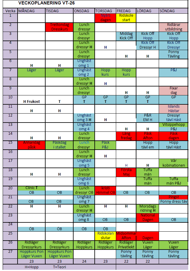 Grön = Ridskoleaktivitet Blå = Tävling för privat ekipage Röd = ingen ridskola